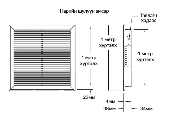 | Танай объектын агааржуулалтын хоолойн өгөх болон сорох хэсэгт суурилуулах зориулалттай нарийн хийцтэй тус амсрыг олон төрлийн өнгөний сонголттой хэмжээ загвараар үйлдвэрлэн нийлүүлж байна. Энэхүү бүтээгдэхүүн нь жигд тууш нарийн далбаа нарйин хүрээтэй тул дотор хананд суурилуулахад цэгцтэй загварлаг харагдана. Агааржуулалт болон интерьерийн төгс хослол юм. |