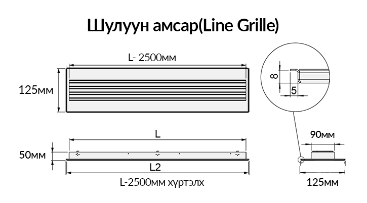 Ахуйн болон үйлчилгээний зориулалттай барилга байгууламжын тууш коридор болон тек, уналттай тааз цонх дагуу суурилуулахад тохиромжтой. Үйлдвэрийн цутгамал хүрээтэй, агаарын урсгал тохируулагчтай, хоёр эгнээтэй, эгнээ тус бүр чиглүүлэгч хос далбаатай шулуун амсрыг үйлвэрлэн нийлүүлж байна. |
