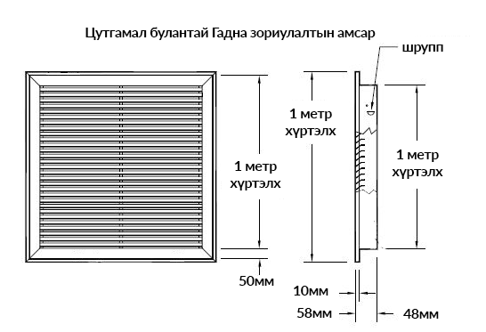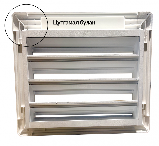 | Барилгын агааржуулалтын хоолойн гадна талд суурилуулах зориулалттай. Ихэвчлэн цахилгаан түгээх байгууламж болон зоорийн давхар гэх мэт хүний хөлийн хөдөлгөөнт хэсэгт суурилуулахад тохиромжтой. Учир нь гадны ямар нэгэн механик хүчний үйлчлэлд тодорхой хэмжээнд тэсвэртэй. |